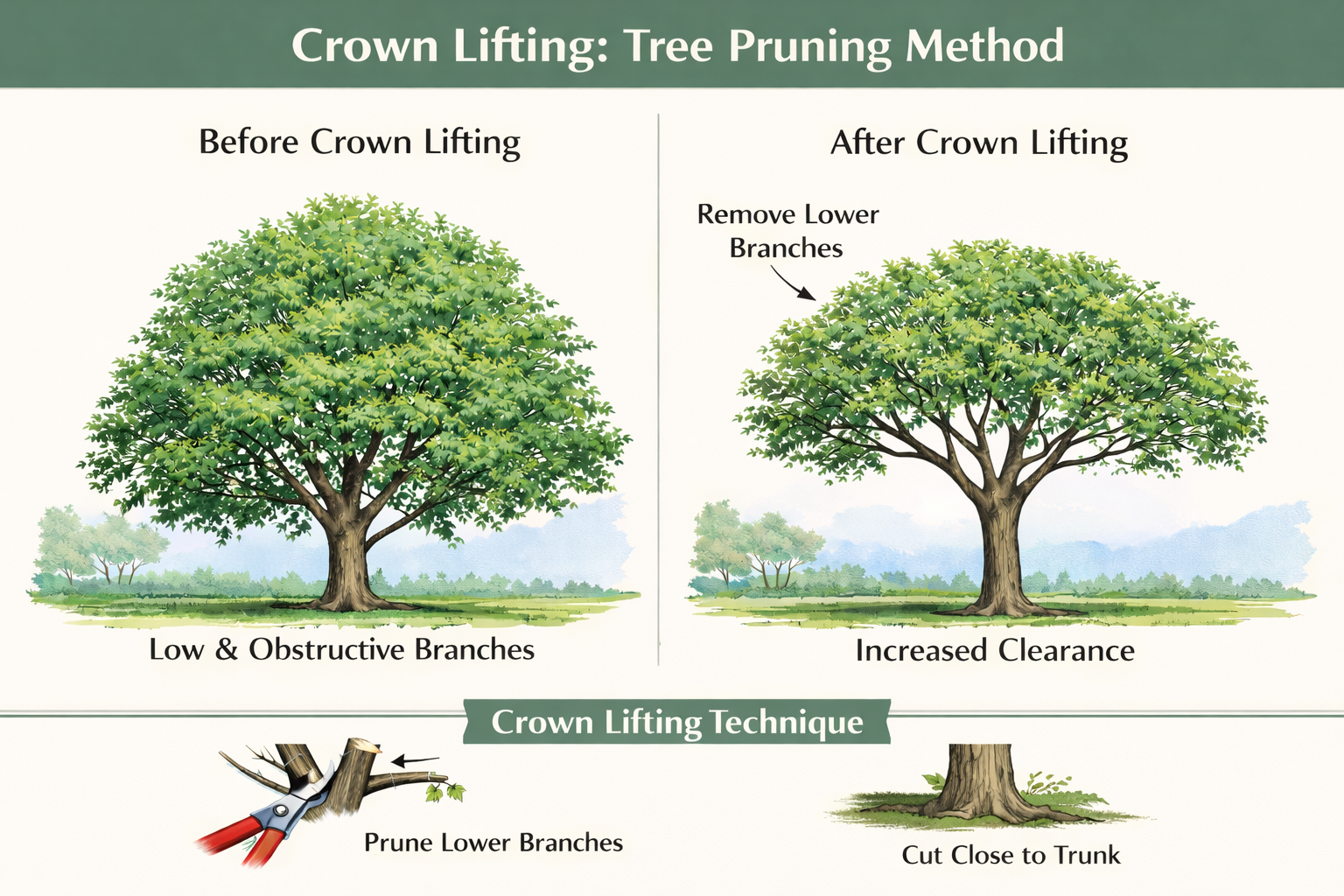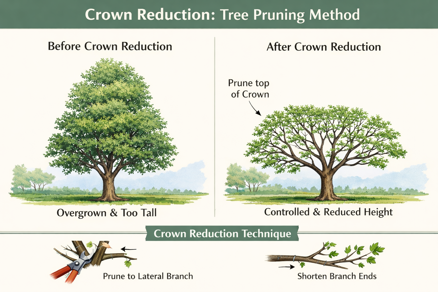 Pollarding: Pollarding is a traditional pruning method where a tree is cut back to the same points on its branches on a regular cycle, typically starting when the tree is young. This creates a framework of knuckles from which new shoots repeatedly grow. Trees are pollarded to control size, manage clearance near buildings or utilities, reduce wind load, and maintain a uniform form. When maintained properly, pollarding can reduce the risk of large limb failure and extend a tree’s useful life in urban settings.