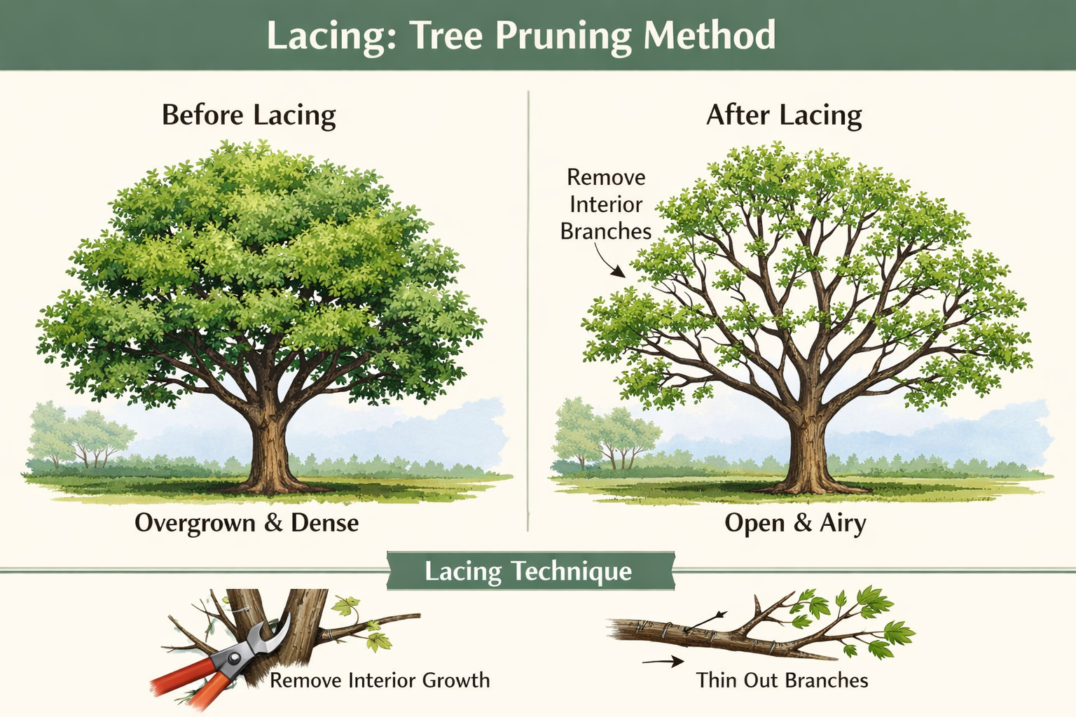 Is your tree looking overgrown, dense, and bushy? If so, having your tree laced will remove smaller interior branches, improve general structure, reduce weight, and increase air and light penetration into the tree canopy. This should be standard maintenance for most trees as it helps to decrease the risk of both disease and the formation structural problems, keeping it happy and healthy for years to come.